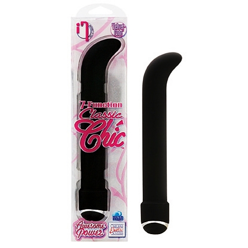 7 Function Classic Chic G-Spot Black Vibrator. Awesome power! Velvety soft and silky smooth massagers with easy and discreet push button operation. 7 powerful functions of vibration, pulsation, and escalation. Vibrator measures 6.25 inches long by 1 inch wide. Bulk weight 2.5 ounces. Vibrating sex toy requires 2 AAA batteries, not included. Do not leave batteries in the vibrator between uses. Safe and pure for body and pleasure. Made using phthalate free, non-toxic materials ABS plastic with smooth and seamless Velvet Polyurethane PU Cote. Always clean before and after use plus between partners. A water based lubricant is recommended.