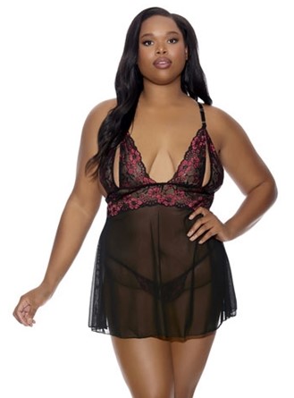 Playful and feminine, this stunning plus size baby doll teases and floats, grazing the top of the thigh with its see-through mesh. Above, the red and black lace brocade bodice and cups are form-fitting, with peek-a-boo slits that beckon the eye to linger. A single-string open thong is veiled at the front and accentuated at the back with a saucy break in the skirt that reveals a bare derriere and a high-waisted thong strap.