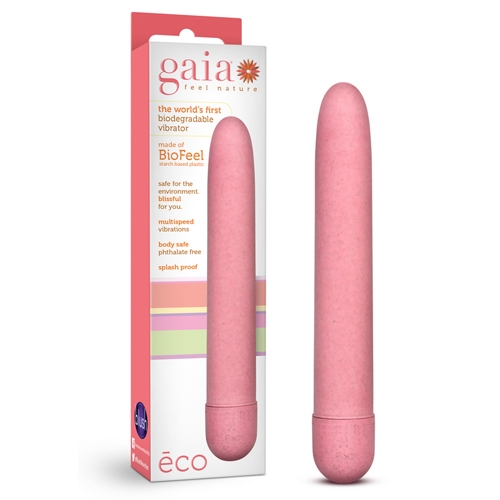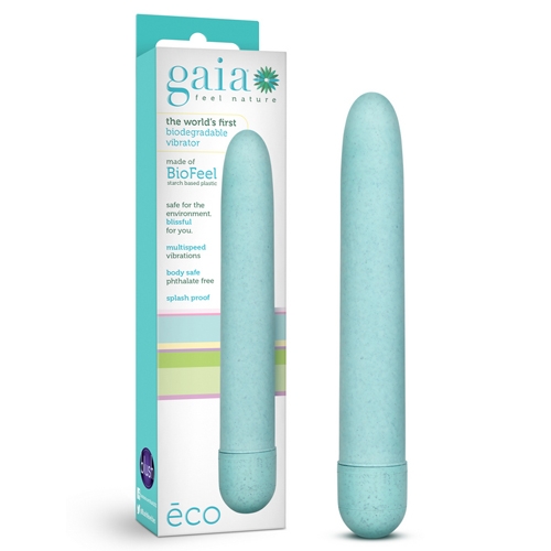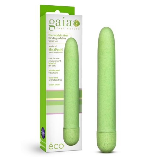 TheGaia Eco is the world s first biodegradable and recyclable vibrator! The Eco is crafted from Biofeel- a starch based bioplastic. Take comfort knowing that Eco uses less energy creates less greenhouse gas emission than any other sex toy on the market! The Eco s design is classic and can be used for internal or external stimulation: including a slim profile and tapered tip for comfort. With quiet multispeed vibrations controlled by the twist of a dial, it s easy to find your perfect sensation. This toy is body safe and easy to clean! Just wash with warm soap and water, or your favorite toy cleaner, before and after every use. Pat dry with a soft towel before storing.