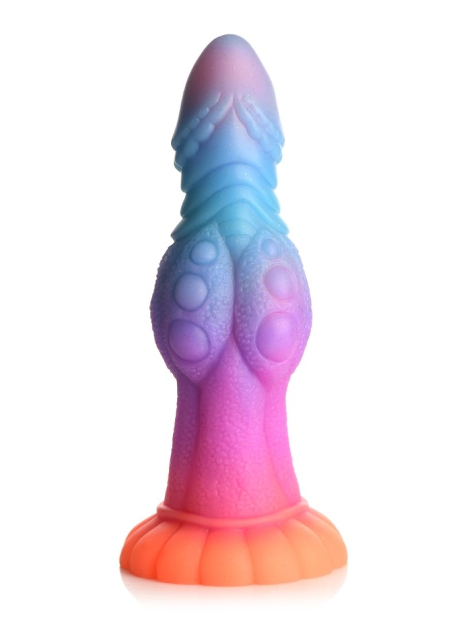 Indulge in this highly stimulating Galactic Alien dong! This colorful, glitter-filled sunburst of pink, orange, blue and purple glows green in the dark! Its unique texture has layers, grooves, bumps, ridges and both smooth and gravely surfaces that slide in effortlessly as they stretch you open! Its large head has a tapered tip that helps with insertion, and then you can enjoy the feeling of a large bump in the center where it gets thick again. Made out of premium, flexible, phthalate-free silicone, this dong is body-safe and best used with water-based lubricants only. Enjoy hands free rides due to the strong suction cup base! Invite a partner to indulge in kinky cosplay or fantasy roleplay and use their favorite harness to transform this dong into a strapon! Afterward, make sure to wash it with warm water and mild soap, then spray it with a toy cleaner and air-dry. Keep out of direct sunlight and heat.