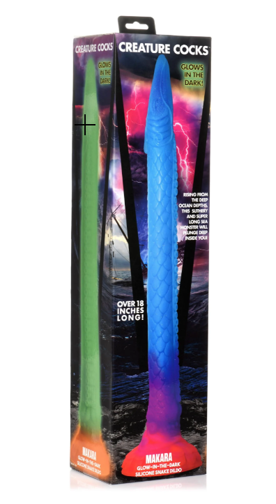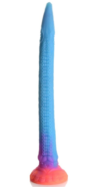 This may be the most beautiful anal hose you’ve ever seen! This 16 inch long dildo is perfect for snaking your drain, and this time it looks like a mystical sea snake! With a base that is sunburst colors of yellow and orange and a body that is shades of purple and blue, it also has fine, detailed designs along the body and glitter embedded in it, too! From the flower petal base to the scaled and sucker-covered body to the sea snake head that has gills, eyes and a mouth, this is a gorgeous toy you’ll be proud to show off or privately enjoy! Made out of premium, phthalate-free silicone, it has a firm core and is flexible and smooth. When exposed to UV light or sunshine, it also glows in the dark! Use the wide, suction-cup base to keep it in place and use it hands-free, or combine it with a compatible strapon harness for kinky cosplay, fantasy roleplay, or hot pegging play! After play is over, wash the dildo with warm water and soap and use a toy cleaner to spray clean. Wipe dry and store in a cool, dark place out of direct sunlight.