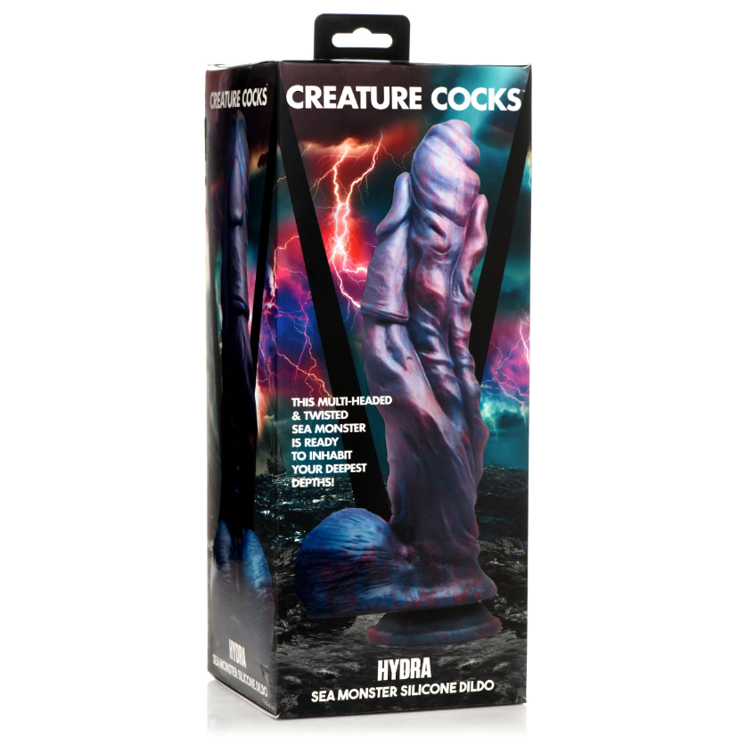 This salty sea monster comes with three heads ready to please and penetrate you! The dark blue and red colors swirling to make an even deeper purple add to the mystical look of this Hydra Sea Monster Creature Cock. The two smaller heads twist around the large one in the center offering different points of pressure and varying textures as it goes deep inside. At the base are a large pair of balls to match this massive 10 inch dildo. Made of premium silicone, it is firm and flexible with a soft, smooth surface. It’s completely body-safe and phthalate-free but must only be used with water-based lubricants. At the wide base below the balls is a strong suction cup that can be placed on any flat surface or hands-free rides. The wide base doubles to make it a strap-on compatible dildo, too! Pair it with your favorite strap-on harness for pegging play! Perfect for kinky cosplay, fantasy roleplay and for just adding a little more fun and variety to your toy collection! After use, wash with warm water and mild soap, then rinse and spray with a toy cleaner before patting dry. Store separately from other silicone toys out of direct sunlight.