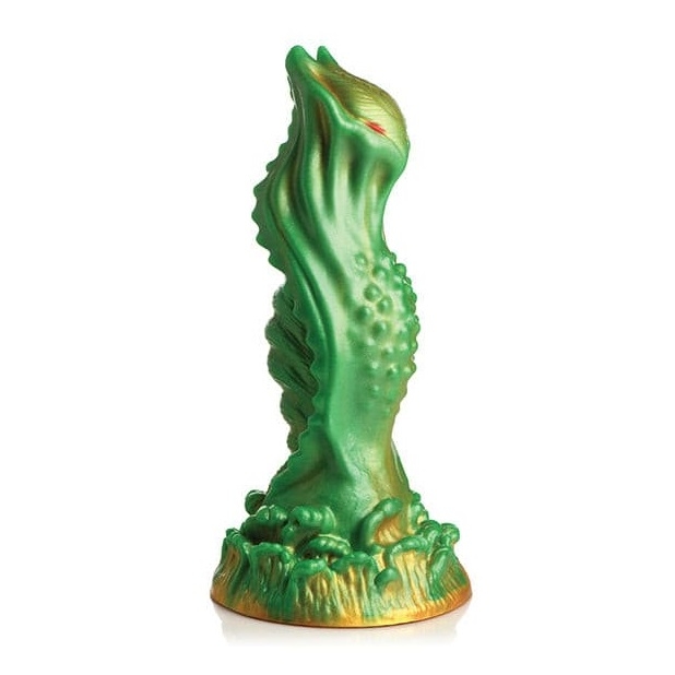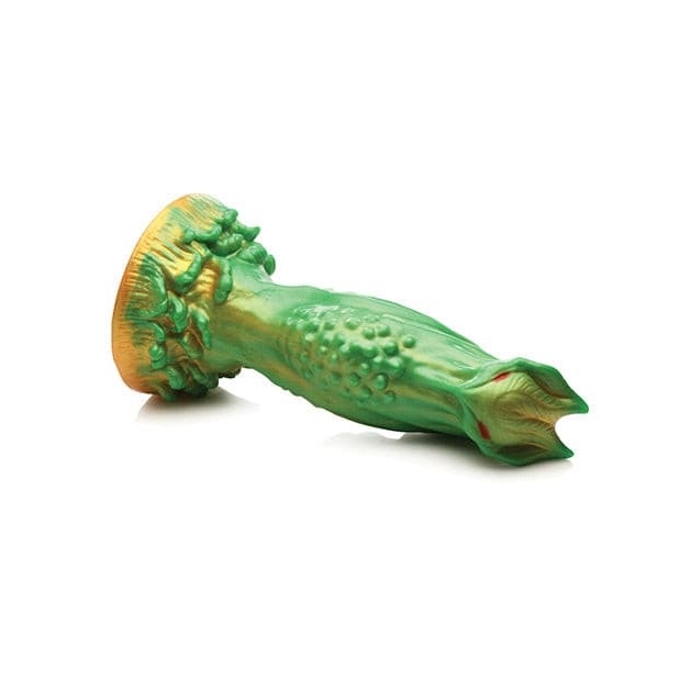 This cute Andromeda alien is the perfect size to crawl inside your most intimate of places! Green and gold skin shine when light hits it. Two narrow, red eyes watch you with a menacing glare. The head has small, soft ears, a narrow face and a bumpy, large chest that makes the dong swollen at the center. It is textured for your pleasure and will satisfy you in new ways that only this alien can deliver! Made out of premium, flexible, phthalate-free silicone, this dong is body-safe and best used with water-based lubricants only. Enjoy hands free rides due to the strong suction cup base! Invite a partner to indulge in kinky cosplay or fantasy roleplay and use their favorite harness to transform this dong into a strapon! Afterward, make sure to wash it with warm water and mild soap, then spray it with a toy cleaner and air-dry. Keep out of direct sunlight and heat.
