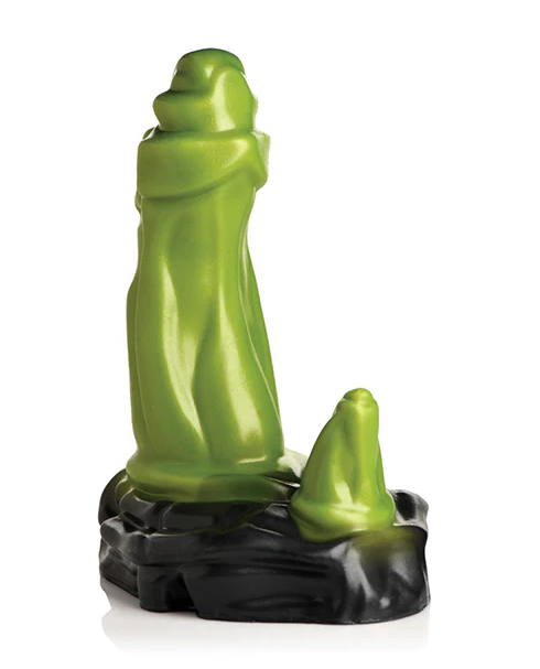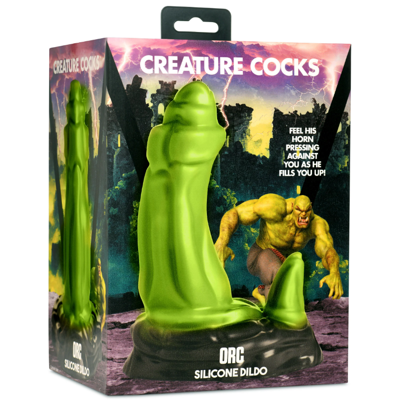 This massive Orc rod has an extra surprise at the base! The green, firm yet flexible shaft has a small knobbed tip that flares out and then nearly doubles in width as you receive the full shaft! At the base of the dong is an extra horn designed to stimulate your clitoris or perineum for dual stimulation! Enjoy the smooth ridges of this monster rod as this creature ravages you! The wide base provides powerful suction so you can go hands-free by placing it on any flat surface to keep it in place. You can also combine it with a compatible strapon harness for pegging play! Made out of premium, phthalate-free silicone, it has a firm core and soft, silky surface. Use only with water-based lubricants for best results. After play is over, wash the dildo with warm water and soap and use a toy cleaner to spray clean. Wipe dry and store in a cool, dark place out of direct sunlight.