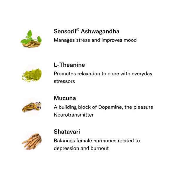 Ashwagandha, Rhodiola, Shatavari, L-Theanine, Mucuna Pruriens.