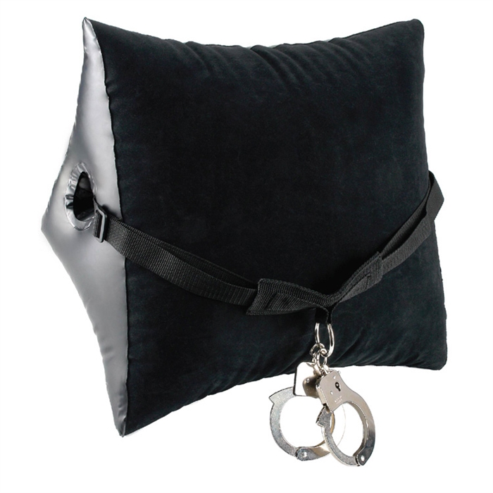 This inflatable position pillow has a hollow center designed to anchor a super strong nylon strap, which then connects to a pair of heavy-duty metal cuffs. Once your subject is bent over the wedge-shaped pillow and strapped in, they’re unable to move or escape while their hands are cuffed to the strap’s heavy-duty O-ring centerpiece.