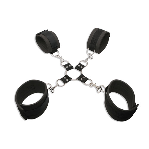 Take total control over your lover’s every move with this Extreme Hogtie Kit. This easy-to-use hogtie kit includes neoprene wrist and ankle cuffs, a heavy-duty metal hogtie, and free satin love mask. Enjoy the the thrill of being hogtied without having to worry about complicated techniques and tying elaborate knots. The cuffs attach to the hogtie with spring-loaded metal clips and easily adjust with velcro to fit most sizes. Once your lover is on their stomach bound and tied, what happens next is up to you!