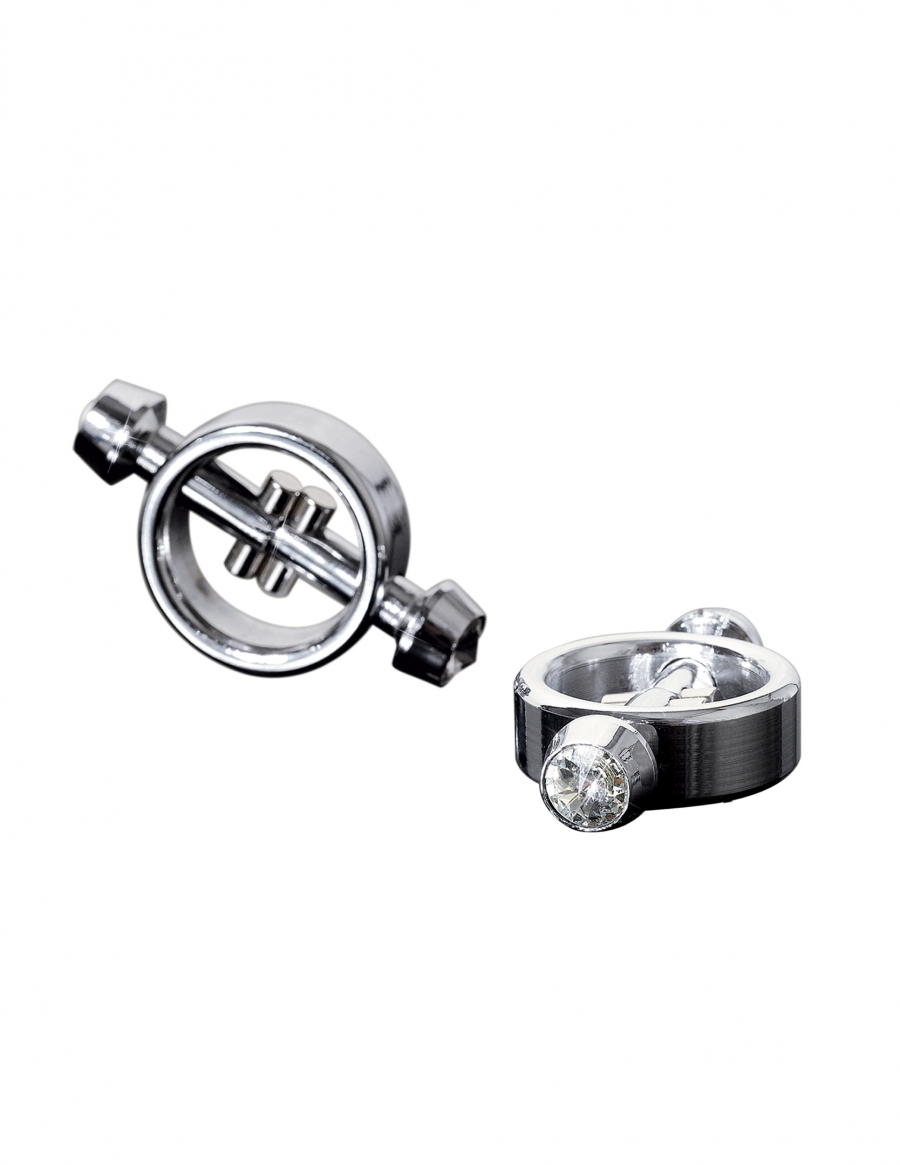 Give “precious metals” a whole new meaning with this luxurious pair of high-end magnetic nipple clamps. Cast in high quality steel and hand-polished to perfection, these jeweled gems are equal parts art and pleasure. The hygienic metal finish is sleek, nonporous, and easy to clean, while the design is body-inspired and made to excite.