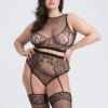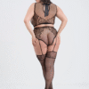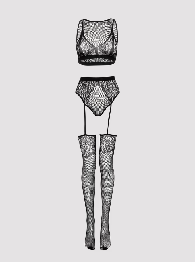 This set comes with everything you need to look and feel like your most authentic and seductive self. The two piece includes a high waisted lace bottom with attached garters and stockings as well as a lace fishnet bra. It has everything you need for a sensual night in, but it also makes for the perfect versatile addition to your wardrobe.