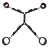 - Padded faux leather cuffs with buckles are fully adjustable and feature D-rings for versatile play