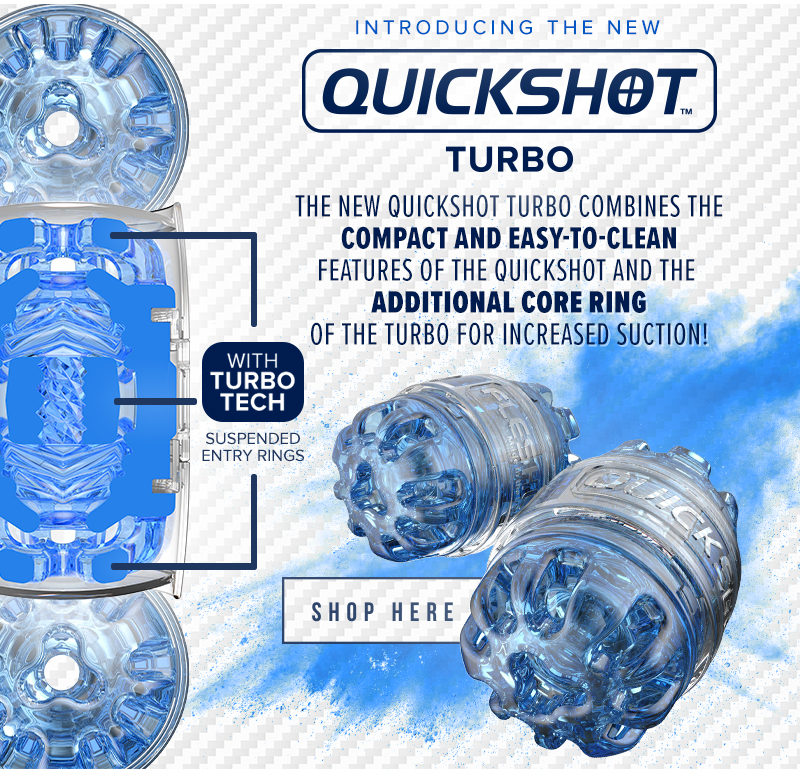 Introducing the Quickshot Turbo, an all-new version of our top-selling compact Fleshlight. Engineered with Turbo Tech, this pocket-sized male masturbator was designed to deliver you a snug, sucking, and gripping sensation, unlike anything you’ve ever felt before. As you slide in, our patented suspended entry ring system comfortably latches onto your rigid member, begging you to venture deeper within. The Quickshot Turbo combines two of our most popular products into a discreet, open-ended stroker engineered to turn ordinary masturbation into a turbo-charged, intensely pleasurable session.