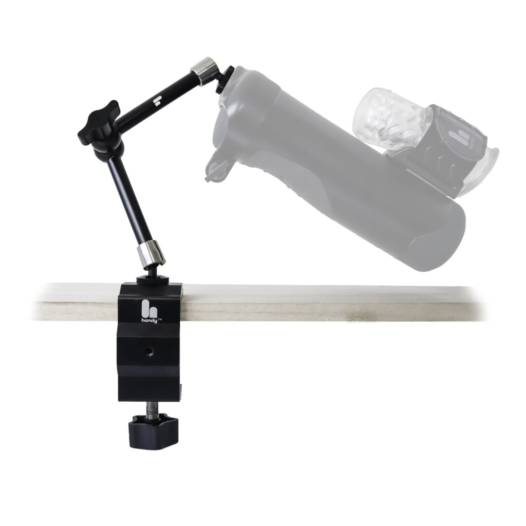 The Handy HandsFree Desk Mount is designed to maximize your experience with Handy by removing the need to hold it. Enjoy the moment and immerse yourself in your Handy experience. It includes a desk clamp with two 1/4’’ threads for vertical or horizontal setup and an articulating arm with 1/4’’ screws on both ends. Requires a Handsfree Cup to attach your Handy. Item available with added discount as part of Handsfree Bundle and Full Handsfree Bundle.