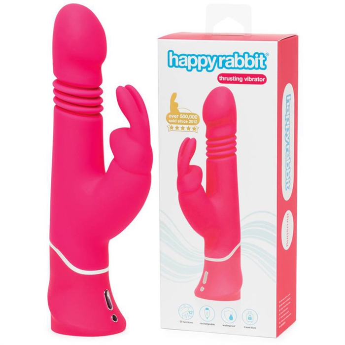 happy rabbit® Thrusting Realistic vibe’s vital function stats: ears: 9 x speeds and patterns; shaft: 3 x thrusting speeds.