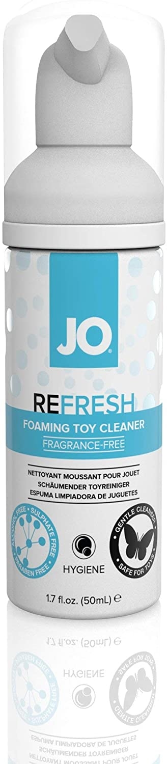 Take care of intimate items with JO® REFRESH FOAMING TOY CLEANER. Designed to clean with a gentle formula that is both fast acting and leaves no residue. The Triclosan and Paraben free option is safe for all toy materials and gentle on hands during use. Simply apply a coating of foam to toy and leave on for 5-10 seconds before rinsing clean. For tougher to clean spots massage product thoroughly.