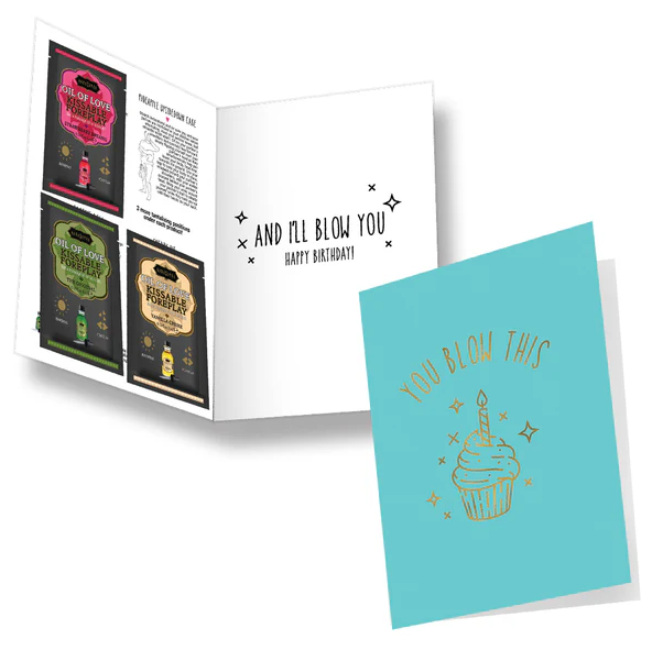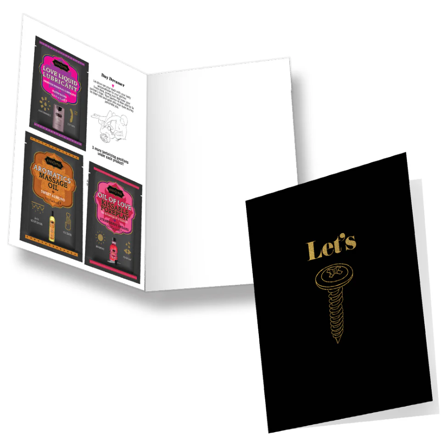 Includes three tempting products to inspire desire. Each card features a flirty message, four Kama Sutra Positions and three Romance Product Packets.