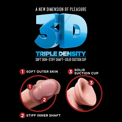 The King Cock Plus Triple Density dildo has a stiff inner shaft, a soft outer skin, realistic texture details and a solid suction cup! The improved design & formula offers superior realism with a soft, lifelike exterior, creating the feel and flexibility of a real penis.