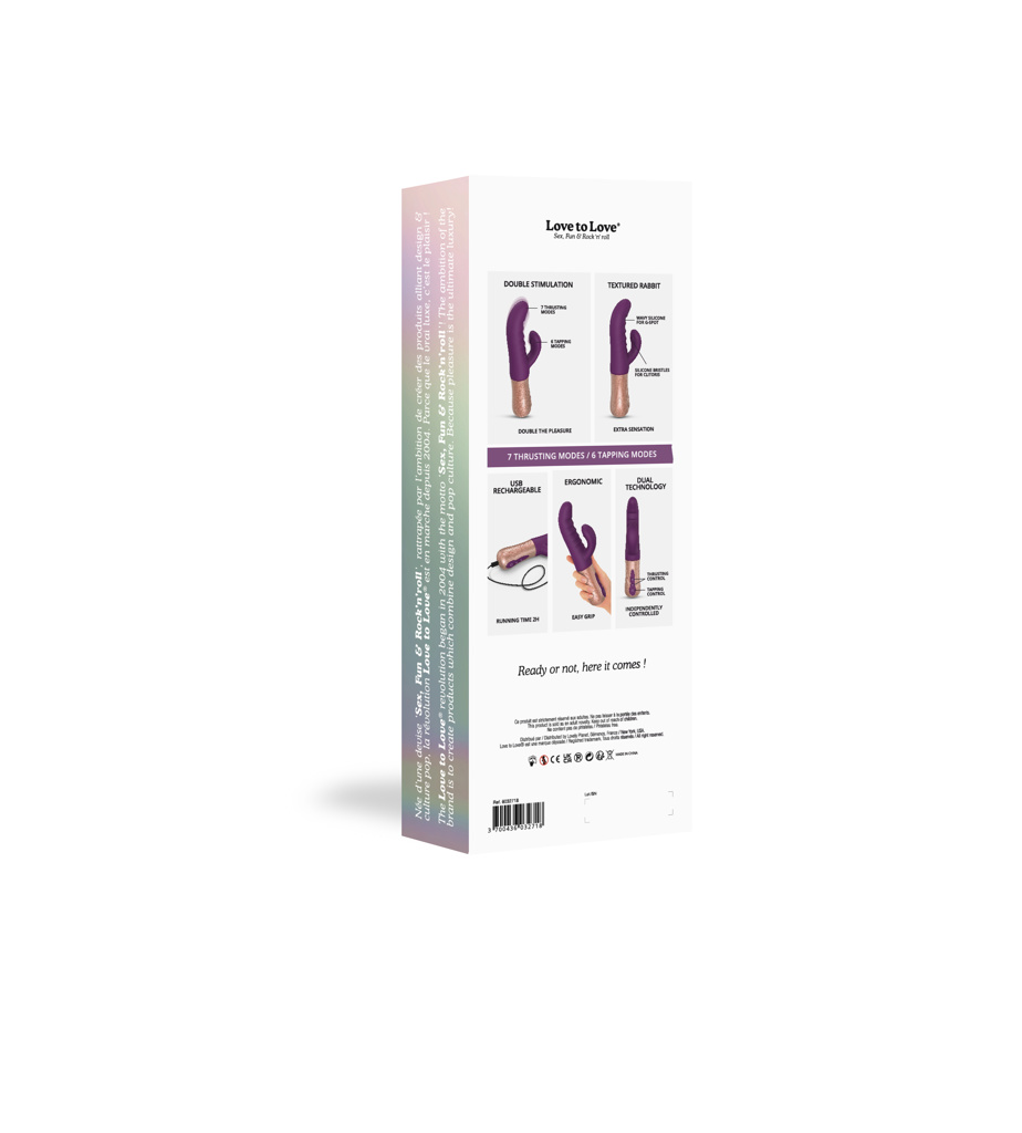 A little gem of technology, this rabbit is equipped with two kinds of out of world stimulation: back and forth thrusting to capsize your G-spot and powerful tapping technology to ignite the clitoral area. This performance beast is equipped with two very powerful motors for ever more intense double stimulation. Design and textures have been carefully worked on to offer an anatomically explosive product!