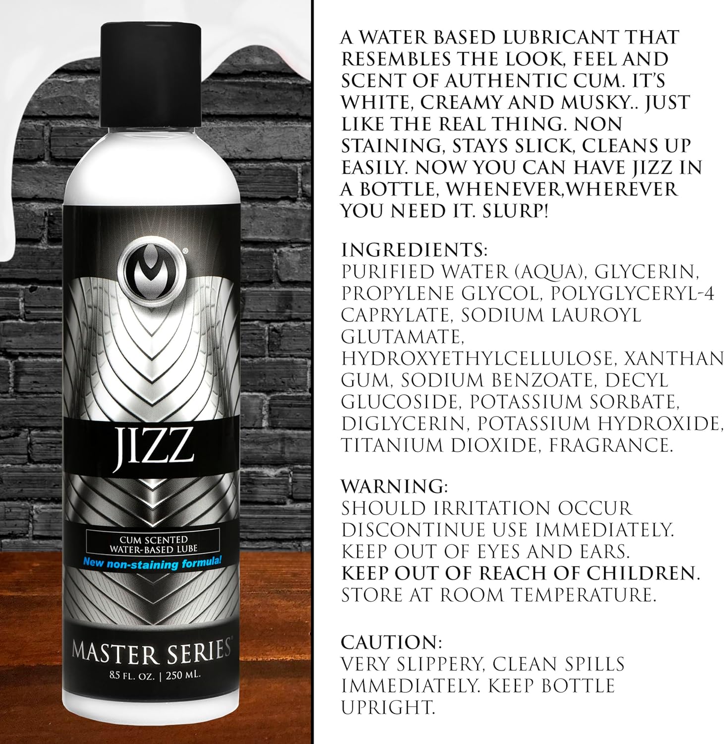 A water based lubricant that resembles the look, feel, and scent of authentic cum! It is white, creamy, and musky…just like the real thing. Non staining, it stays slick and cleans up easily. Now you can have jizz in a bottle, whenever, wherever you need it!