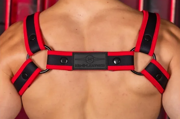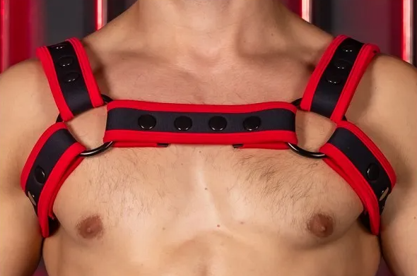 Mr. S’ Carbon Black Bulldog Harness uses a sleek black neoprene as the base and pairs it with vibrant color banding for a hot look that will make you impossible to miss. Pair this harness with the rest of the matching Carbon Black Collection or wear it with your favorite pair of well worn jeans. Super lightweight so it packs easy and is great for for a long night of dancing or fucking.