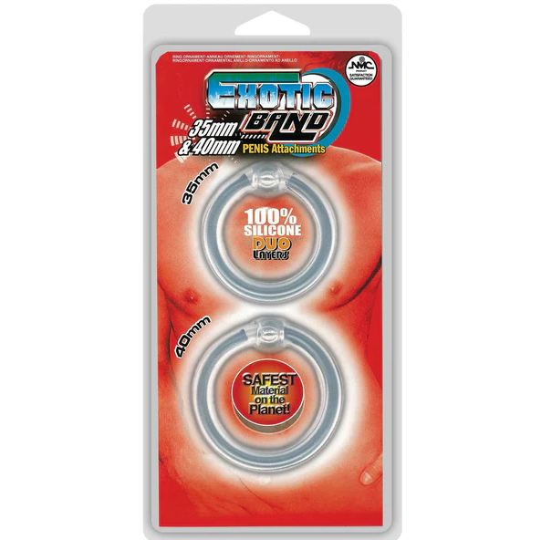 Dual density stretchy silicone rings in two sizes, 35mm and 40mm, provide endless combinations of restrictive erectile enjoyment. Suitable with water-based lubricants. Wash with soap and water after use.
