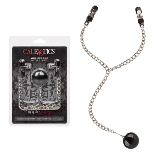 Blur the borders between pleasure and pain even further with the game-changing Nipple Play® Weighted Disc Nipple Clamps. Explore elevated sensation with 2 adjustable nipple clamps, a thrilling chain and unique weight. Clamp the naughty clasps to your body and enjoy every rush of stimulation