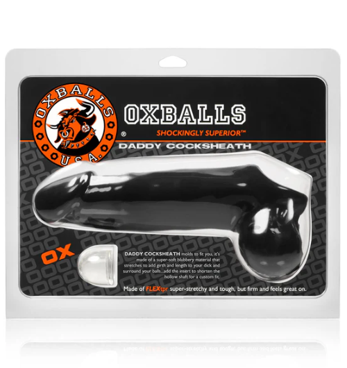 The Daddy Cocksheath from Oxballs molds to fit you, stretches to add girth and length, and surrounds your balls. Totally customizable, add the insert to the hollow shaft to shorten the length for a comfortable fit.