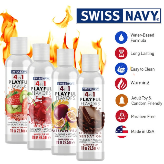 Playful Flavors are four products in a single slippery glide: warming, flavored, lubricant, and massage glide. The paraben-free, sugar-free, non-staining and non-sticky formula is available in 4 flavors. Indications for use: water or silicone based personal lubricants are used by medical professionals to facilitate gynecological and hospital procedures where additional lubricant is needed. Swiss Navy Lubricants are intended for penile and/or vaginal application to enhance natural lubrication and facilitate intimate sexual activity. These lubricants are compatible with both natural rubber latex and polyisoprene condoms.These products are not compatible with polyurethane condoms.