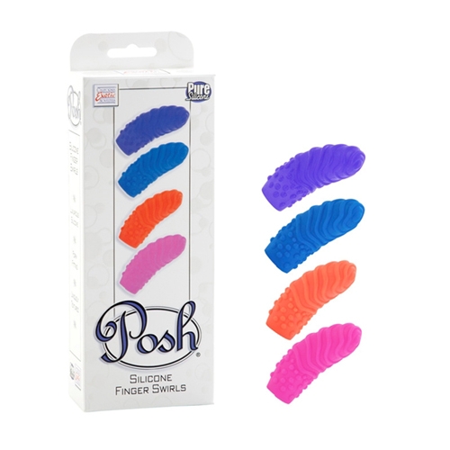 Posh Silicone Finger Teasers Swirl Set of 4 form fitting, uniquely textured, luxurious Silicone finger teasers. Easy to use. Slip sleeve on to finger. Finger extensions. Safe and pure for body and pleasure. Made using phthalate free, non-toxic materials Silicone. Finger sleeves measure 2.25 inches long by 1 inch wide. Bulk weight 0.6 ounce. Always clean before and after use. Category: For Women, More Fun, Probe, Probes, Ticklers. Posh Silicone Finger Teasers Swirl is a registered trademark for California Exotic Novelties. Sex Toys and Sexual Wellness.
