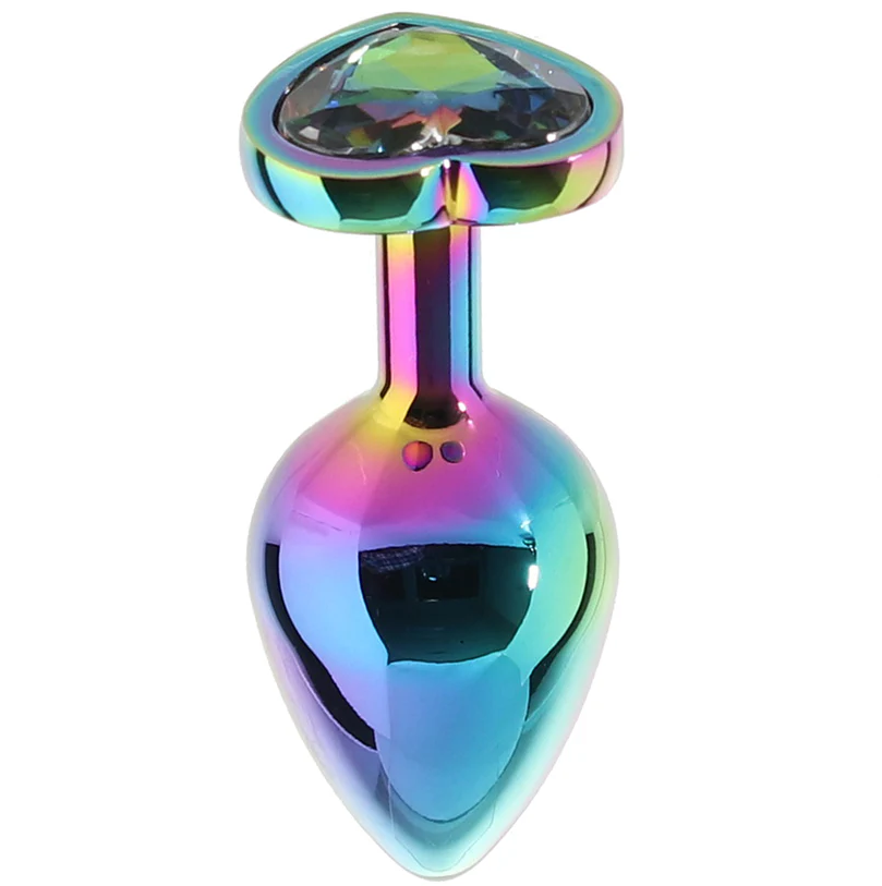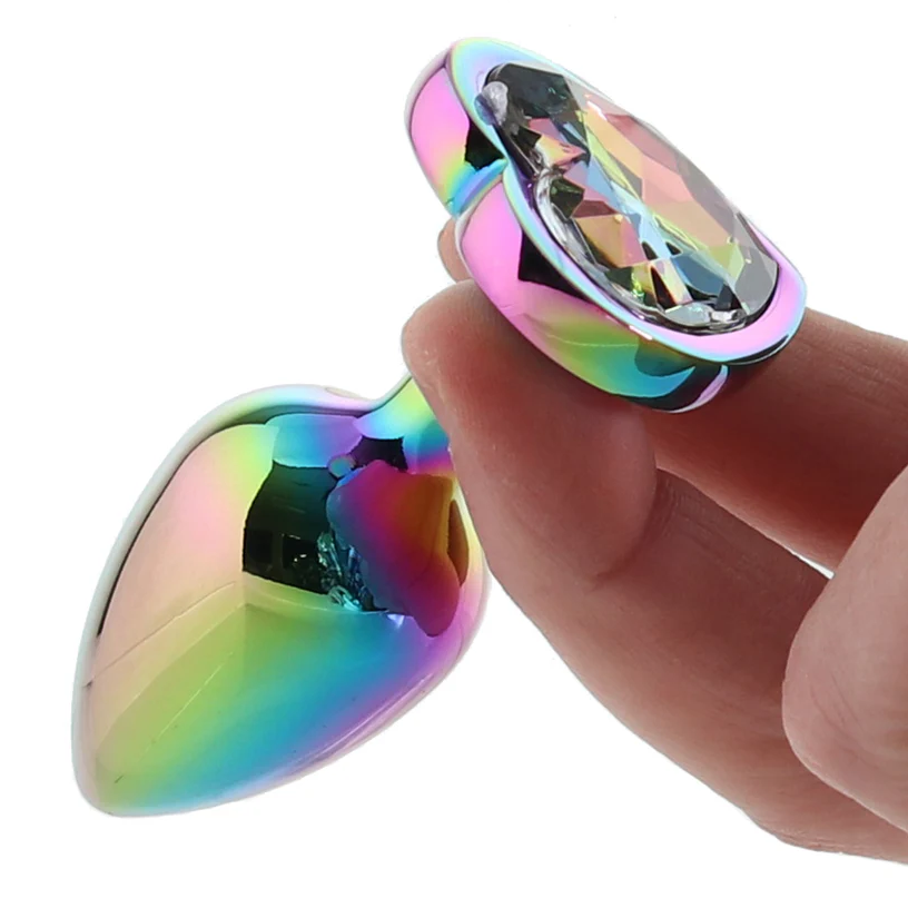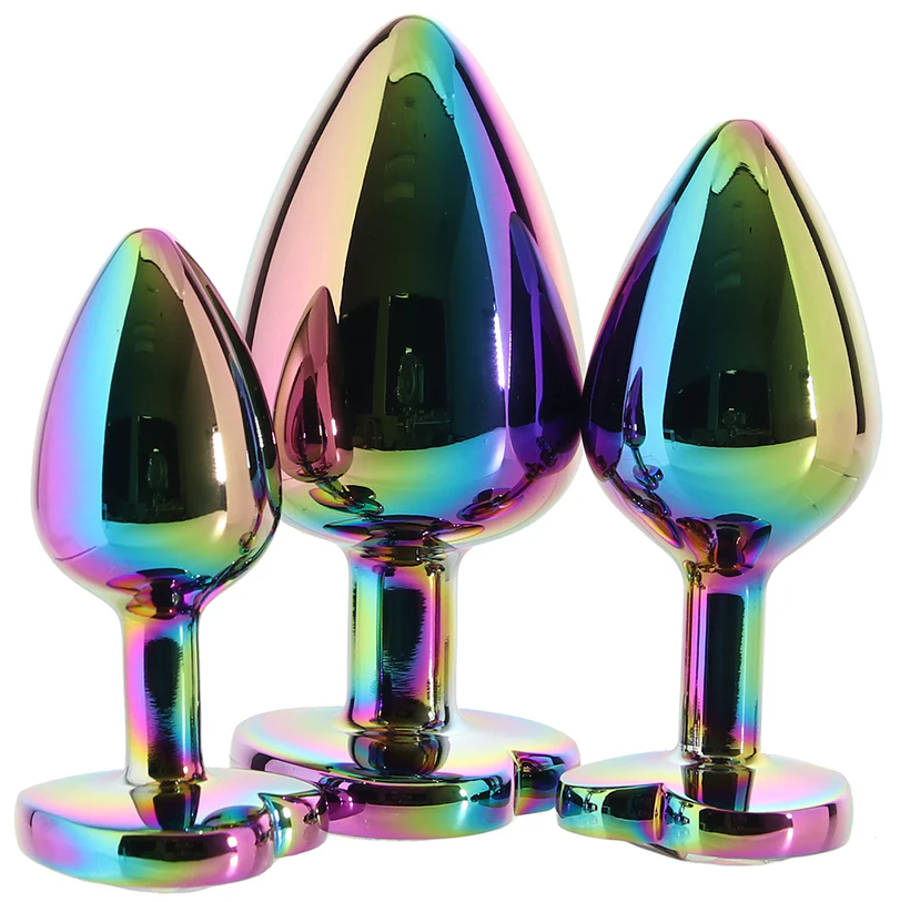 The Rainbow Heart Gem Anal Plug Set is an amazing set of 3 gradated smooth metal butt plugs perfect for beginners and anal pros alike! Work your way up in size with ease and comfort, or get warmed up easily for anal penetration by using this plug set first. These plugs are great for wear during all kinds of play, or even out and about! And the adorable heart shaped gems look stunning from behind!