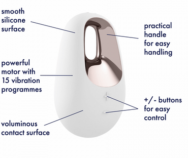 The White Temptation is a lay-on vibrator that sits perfectly on your clitoris with its voluminous, bulbous shape, delivering wave-like excitement and explosive climaxes. The especially powerful vibrations can be adjusted up and down with 15 different vibration programmes consisting of 10 rhythms and 5 speeds. The +/- buttons, which are placed in the delicate, skin-friendly silicone of the device, allow for easy handling, while the clit vibrator fits comfortably in your hand thanks to its ergonomic shape.