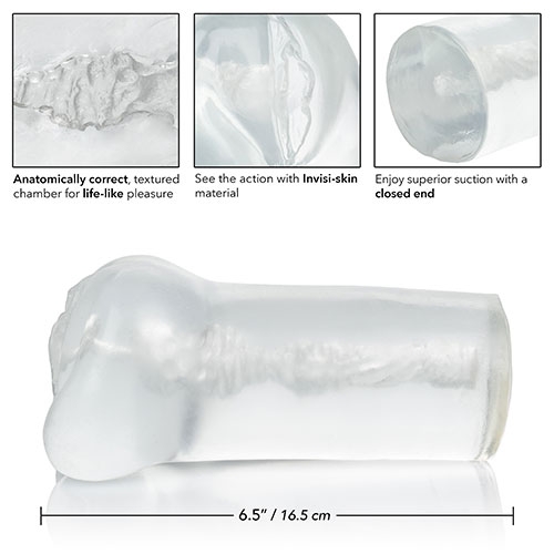 The indulgent stroker has a textured, anatomically correct chamber for explosive stimulation. Use this close-ended sleeve with ample lubrication for powerful suction worthy of your naughtiest fantasies. Invisi-Skin Thermoplastic Elastomer is a super-soft, ultra stretchy material with a unique, life-like feel delivering pure satisfaction in every stroke.