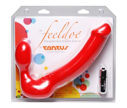 The Feeldoe More by Tantus features a removable vibrator and is made of a harder material for more driving control. It’s a completely unique patented toy, and it’s only made by Tantus Silicone. The only strap-on toy without the harness – the bulb is inserted vaginally which causes muscle reflexes and more intense orgasms and the textured nub provides clitoral stimulation and vibration when using the removable bullet.