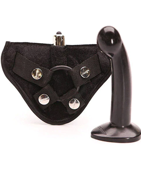 The Sport Kit has one smooth 100% Ultra-Premium Silicone Sport dildo designed for the G-Spot or prostate. The kit features a velvet harness which is comfortable, adjustable (fits hips up to 60” / 152 cm), and machine washable. It also comes with a 1.59” / 3.81 cm O-ring that can be changed for play with larger dildos as well as a built-in pocket that fits a bullet vibrator (included). The pocket holds the vibrator in place and allows access to the controls throughout your strap-on experience.