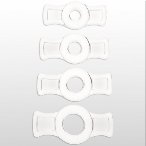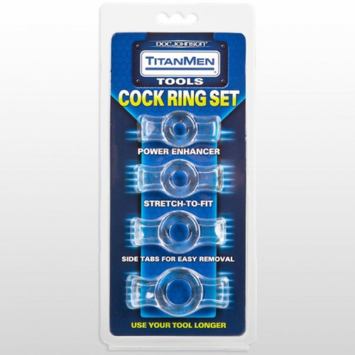 Enhance your member with the most convenient and manageable cock rings available. These TitanMen Tools Cock Rings stretch to fit with the aid of easy to grip side tabs. Each set contains 4 rings ranging in size from 0.4 inch to 0.75 inch un-stretched. The largest flexible ring can accommodate up to a 3 inches diameter shaft. The rings are easy to place and remove, even with slippery hands, because each tab features a thick border, allowing the rings to be adjusted with ease. The TitanMen Tools Cock ring set is made of non-phthalate Thermoplastic Rubber TPR. Features: 4 cock ring set. 4 sizes in each set. Stretches to fit. Side tabs for easy removal. Helps enhance size and girth. Details: Dimensions Extra Large Cock Ring Total Length 2.87 inches. Inside Diameter .90 inch. Stretches up to 3.5 inches. Large Cock Ring Total Length 2.66 inches. Inside Diameter .60 inch. Stretches up to 3 inches. Medium Cock Ring Total Length 2.5 inches. Inside Diameter .50 inches. Stretches up to 2.5 inches. Small Cock Ring Total Length 2.3 inches Inside Diameter .40 inch. Stretches up to 2 inches. Titanmen Cock Ring Set Clear from Doc Johnson Novelties.