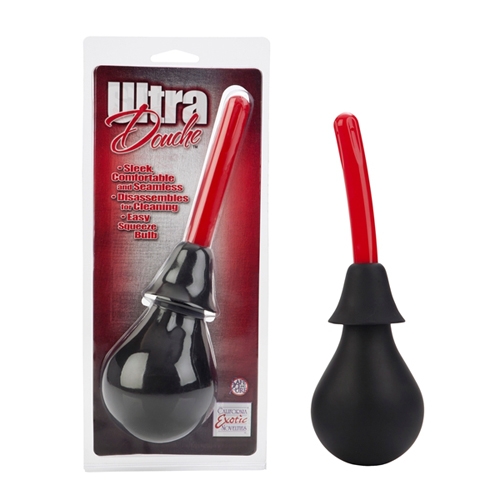 The California Exotic Ultra Douche is a sleek and seamless douche with an easy squeeze bulb. It disassembles for easy cleaning. Phthalate-free PVC (bulb) PP (attachment). 4.25x .75/ 10.75 cm x 2 cm (attachment).