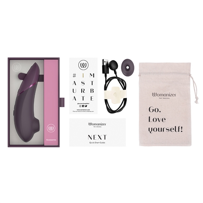 | The Womanizer Next toy comes with a USB charging cable (AC adaptor not included), quick-start guide, compliance & safety information, additional stimulation head and an #Imasturbate sticker. |