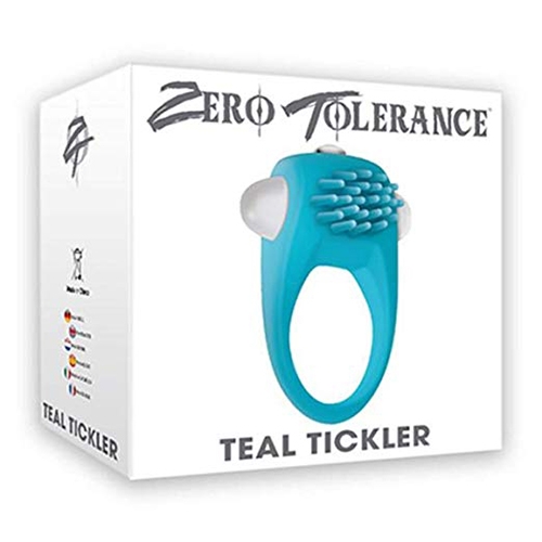 Teal Tickler Vibrating Cock Ring from Zero Tolerance. Ring features clitoral ticklers on the surface. Single speed vibrations. Made using body safe, latex and phthalate free materials Silicone ring, ABS plastic bullet vibrator. Waterproof vibrations.